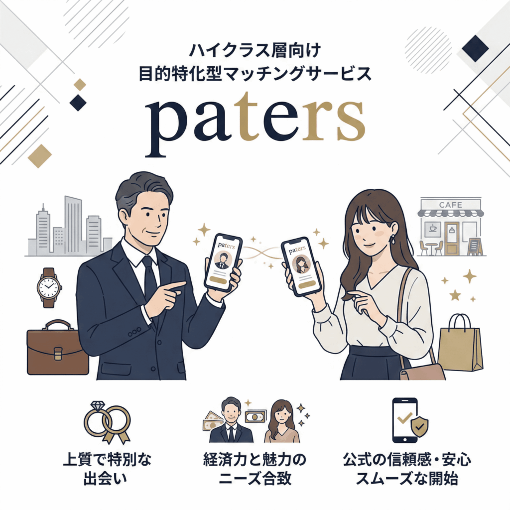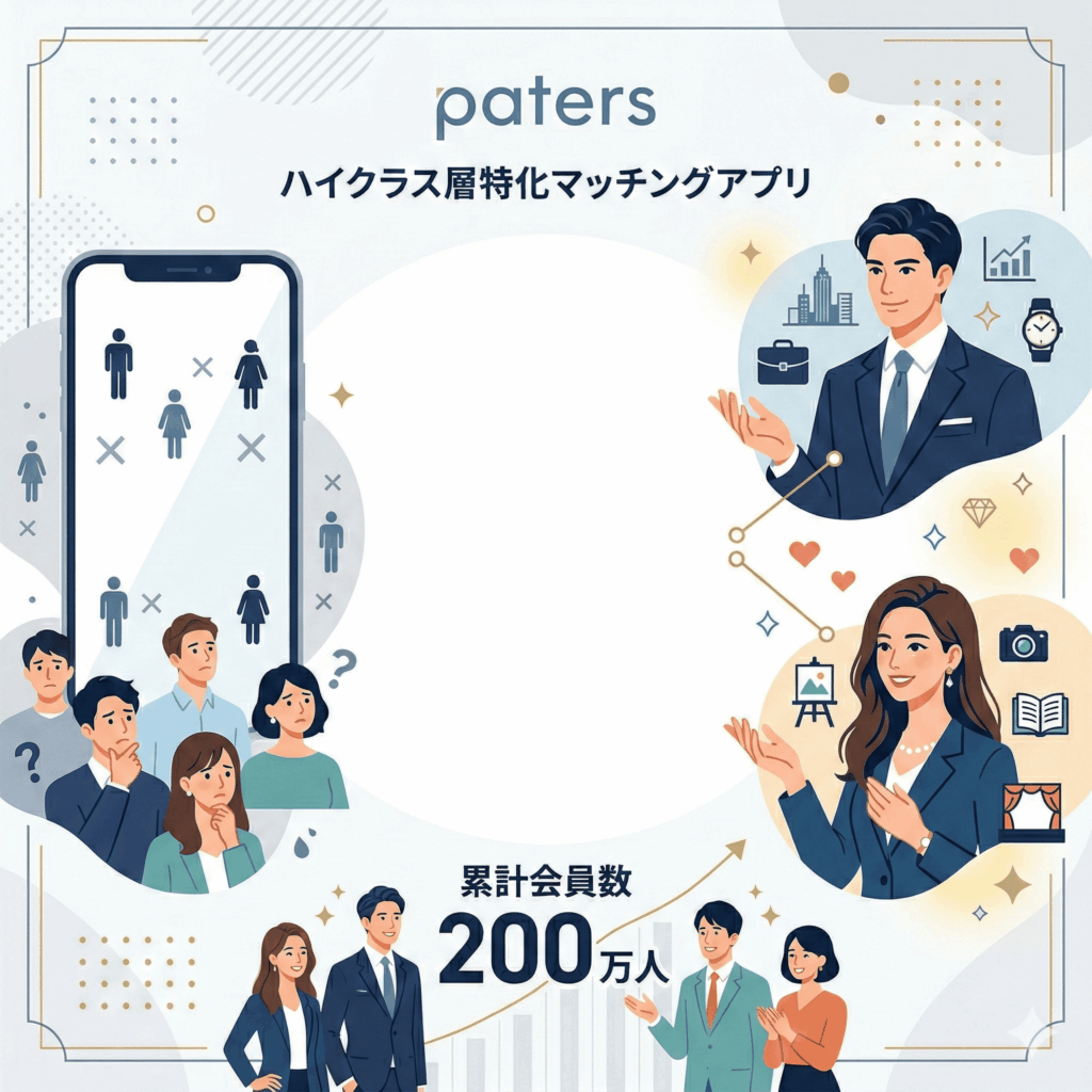 そこで注目されているのが、ハイクラス層に特化したマッチングサービス「paters(ペイターズ)」です。累計会員数は200万人を超え、単なる暇つぶしではない、目的意識を持った男女が集う場として独自の地位を築いています。本記事では、実際にpatersを利用する際の相場観や、他のアプリとは一線を画す特徴、そして利用前に知っておくべき注意点を中立的な立場で整理しました。これから新しい出会いの一歩を踏み出したい方は、ぜひ参考にしてください。
