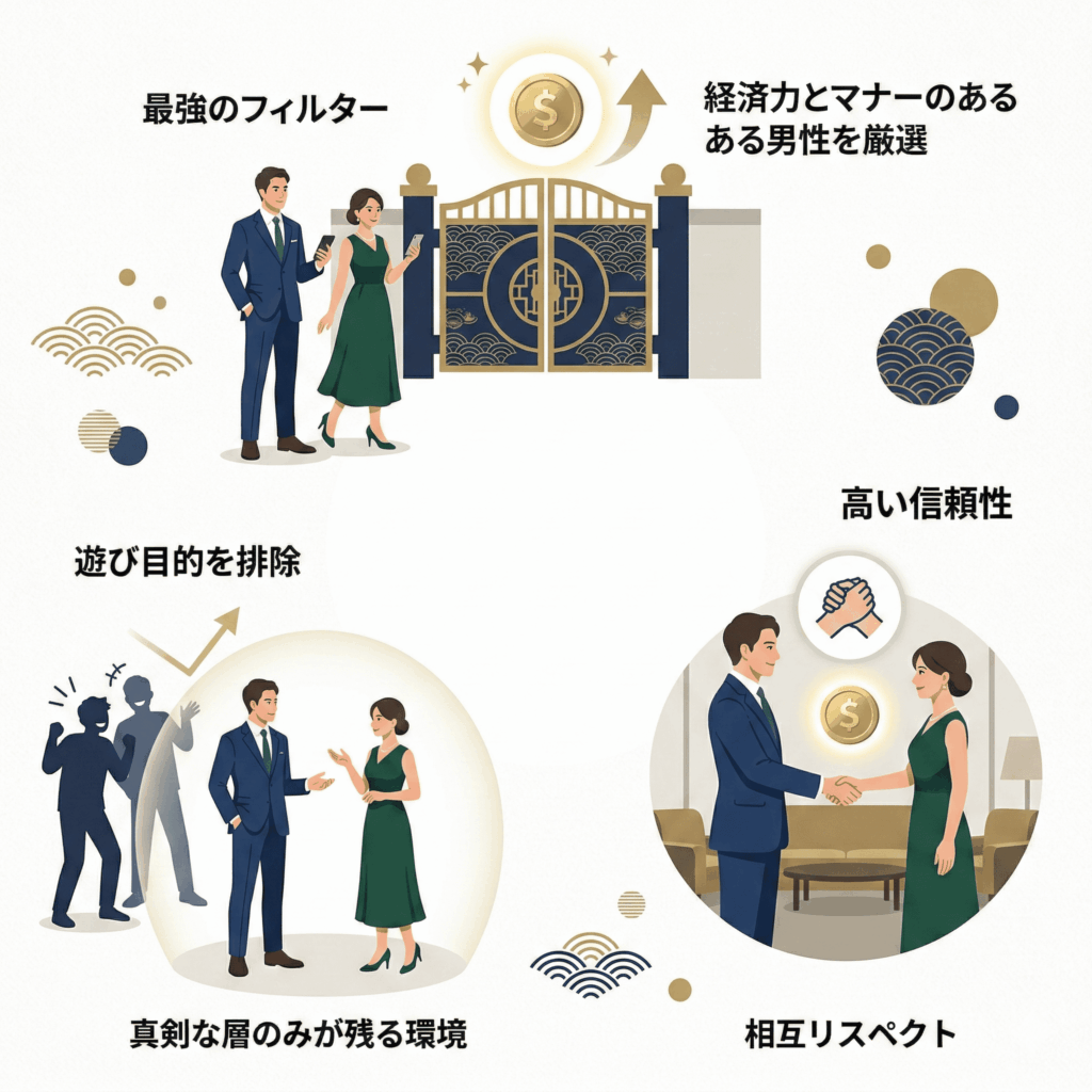 「なぜpatersの料金は他より高いのか?」その答えは、 最高水準の会員コミュニティ を維持するための「参入障壁」にあります。月額1万円を超える設定は、単なる運営費ではなく、マナーと経済力を兼ね備えた男性だけが集まるための強力なフィルターです。低価格なアプリにありがちな、返信が来ない「幽霊会員」や、出会いに真剣でない「冷やかし層」が物理的に排除されるため、結果として1人あたりの出会いの密度が極めて濃くなります。