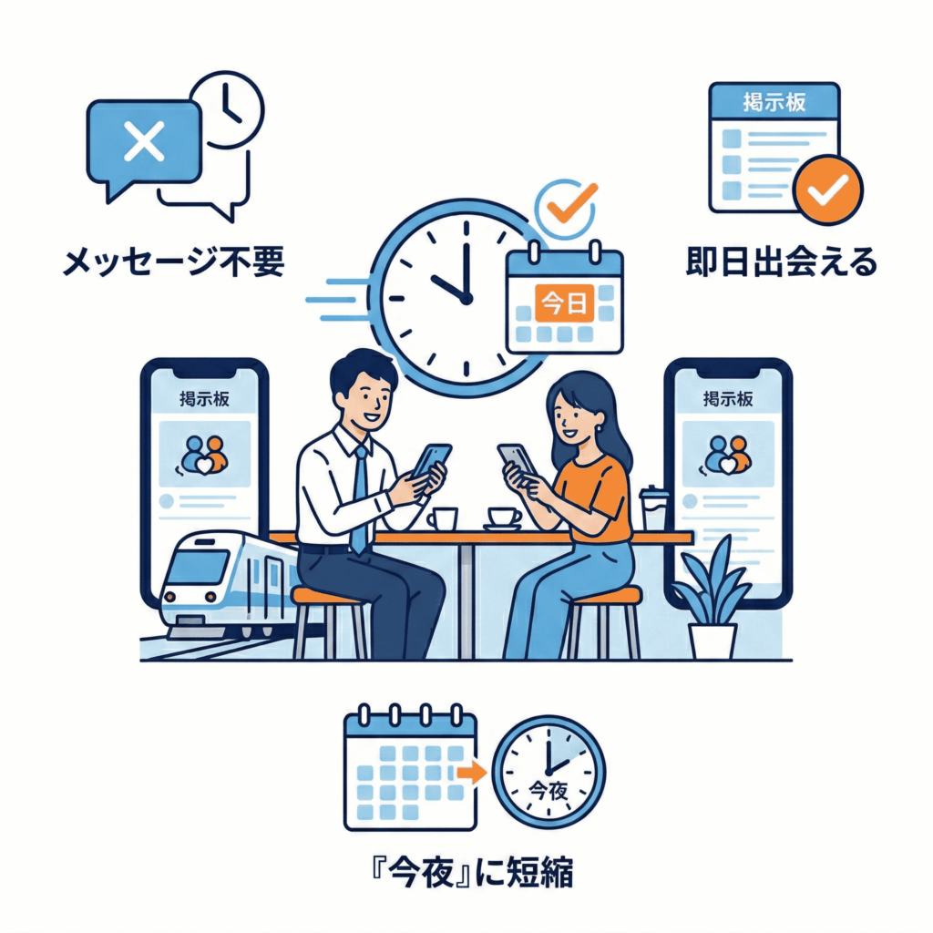 patersが提供する最大のベネフィットは、この非効率を徹底的に排除した「圧倒的なスピード感」にあります。独自の「掲示板(募集)」機能を使えば、その日の気分や急に空いたスケジュールに合わせて、わずか数分で食事の相手を見つけることも珍しくありません。