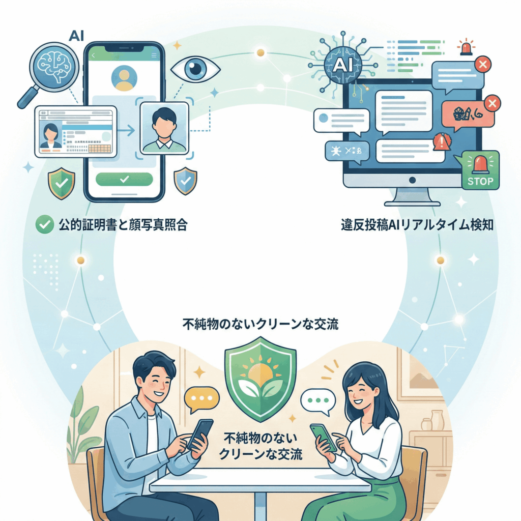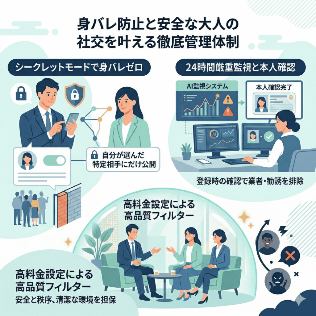 さらに、安全面においては24時間365日の監視体制に加え、AIによる不正検知システムが稼働しています。いわゆる「業者」や「勧誘目的のユーザー」は、登録時の厳格な本人確認プロセスと、運営による迅速な強制退会処置によって極限まで排除されています。実は、patersの「高めの料金設定」こそが、 遊び半分や悪意のあるユーザーに対する最強の防波堤(フィルター) として機能しているのです。