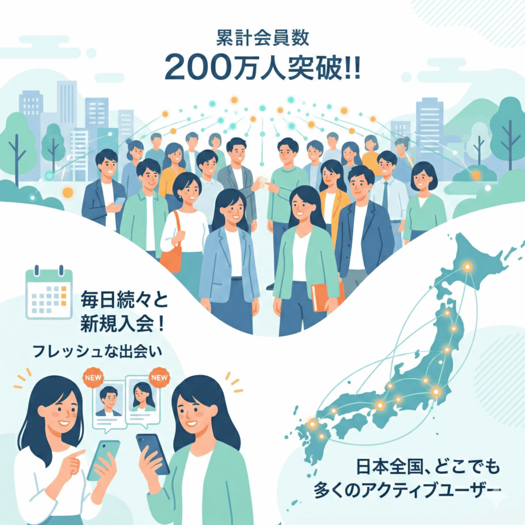 マッチングサービスにおいて「会員数」は正義です。patersは累計会員数200万人を突破しており、これはハイクラス向けサービスとしては国内最大級の規模を誇ります。母数が大きいということは、それだけ「あなたの好みの相手」が常に存在し、新しい出会いが循環していることを意味します。東京・大阪といった都市部はもちろん、地方都市においても多くのアクティブユーザーが活動しており、出張先や旅先での出会いもスムーズに演出できます。